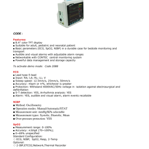 TECHNICAL SPECIFICATIONS Multiparameter Patient Monitor • CE, ISO13485 • SFDA: Class Ⅱb • Anti-electroshock degree:ClassⅠ equipment (internal power supply) • TEMP/SpO 2 /NIBP: BF • ECG/Resp: CF Quality Standards and Classification • Adult/Pediatric/Neonatal(Necllor Spo2&Suntch Nibp)/Surgery/ Operating Room/ICU/CCU (Seperated parameter board) Application Range • 12.1”TFT screen Display Operating environment : • Temperature: 0 ~ 40 ℃ • Humidity: 15% ~ 80% • Pressure: 86.0 kPa ~ 106.0kPa Transport and Storage environment : • Temperature: -20 ~ 55 ℃ • Humidity: 10% ~ 90% • Pressure: 86.0 kPa ~ 106.0kPa Environment • AC: 100 ~ 240V, 50Hz/60Hz • DC: Built-in rechargeable battery • Battery: 11.1V 24wh Li-ion battery • 2h operating after full charge • 5min operating after low battery alarm Power Requirements • Equipment : 305*162*290mm(about) ; 4kg(about) • Package : 380*350*300mm(about) ; 6kg(about) Dimension and Weight • Trend diagram/table: 720h • NIBP review: 10000 events • Wave review: 12h • Alarm review: 200 alarm events • Support drug concentration titration analysis Date Storage • 5 Leads: RA, LA, LL, RL, V • Lead mode: Ⅰ,Ⅱ, Ⅲ, AVR, AVL, AVF, V ECG • Gain: × 1.25mm/mV,2.5mm/mV, • 5.0mm/mV, 10mm/mV, • 20mm/mV (error 5%) • Sweep speed: 6.25mm/s,12.5mm/s,25mm/s, • 50mm/s (error≤ ±10%) • Bandwidth: Surgery 1 ~ 25 Hz • Monitor 0.5 ~ 40 Hz • Diagnostic 0.05 ~ 130 Hz • Sensitivity: >200 V P-P • CMRR≥ 112dB • Differential Input Impedance: >5M • ohm Electrode Offset Potential ±300mV • Polarization Voltage ≥±500mV • Input Impedance ≥5 M • Calibration Voltage: 1mV± 5% Max. Mean Error 5mmHg Max. Standard Deviation: 8mmHg • Overpressure protection: Adult 300mmHg Pediatric 240mmHg Neonatal 150mmHg • ST Segment Range: -2.0mV ~ +2.0mV • Accuracy: Ranging -0.8 mV ~ +0.8mV, measuring error is ±0.02mV or ±10%, The larger prevails. No definition for other ranges. ST Segment • Method: impedance between RA-LL • Resp Impedance range: 0.3 ~ 3 • Base Impedance range: 200 ~ 4000 • Bandwidth: 0.3 ~ 2.5Hz • Gain: × 0.25, × 0.5, × 1, × 2, × 4 • Resp rate:Measurement Range Adult 0 ~ 120BrPM Neonatal/Pediatric 0 ~ 150BrPM • Resolution: 1BrPM • Accuracy: 7 ~ 150BrPM ( 2BrPM) 0 ~ 6BrPM (unspecified) • Apnea Alarm: 10 ~ 40s RESP • Channel 2 • Measure & alarm range: 0 ~ 50 ℃ • Resolution: 0.1 ℃ • Accuracy (no sensor) ±0.1 ℃ (0~50 ℃) (excluding sensor error)TEMP • ECG cable & electrodes • SpO2 sensor • TEMP probe • NIBP cuff & tube • Power cord • Lithium-ion battery • User manual Standard accessories • Etco2 (Optional) • Dual IBP (Optional) • Nellcor Spo2 (Optional) • Suntch Nibp (Optional) • Recorder (Optional) Optional •Measurement range: 0 ~ 100% •Resolution: 1% •Precision: 70% ~ 100% ±2% 0%~69%:no definition given SpO2 •Measure/alarm range: 20 ~ 300bpm •Resolution: 1bpm • Accuracy ±3bpm Pulse Rate •Method: Oscillometry •Measure mode: Manual, Auto, STAT •Measure interval in auto mode:1~5/10/15/30/60/90/120/ 180/240/480min •Measure period in STAT mode: 5min •Pulse rate range: 40 ~ 240bpm •Measure & alarm range: Adult SYS 40 ~ 280mmHg DIA 10 ~ 220mmHg MEAN 20 ~ 240mmHg Pediatric SYS 40 ~ 220mmHg DIA 10 ~ 160mmHg MEAN 20 ~ 170mmHg Neonatal SYS 40 ~ 135mmHg DIA 10 ~ 100mmHg MEAN 20 ~ 110mmHg • Static pressure measurement Range: 0 ~ 300mmHg Accuracy 3mmHg Resolution: 1mmHg Accuracy: